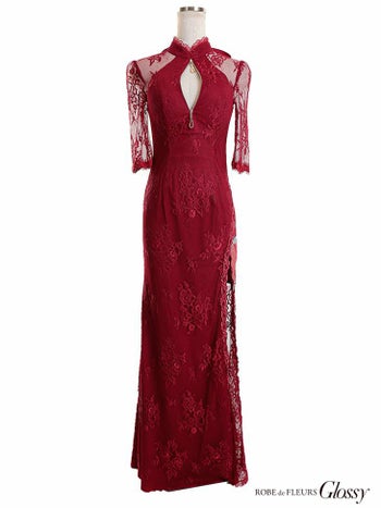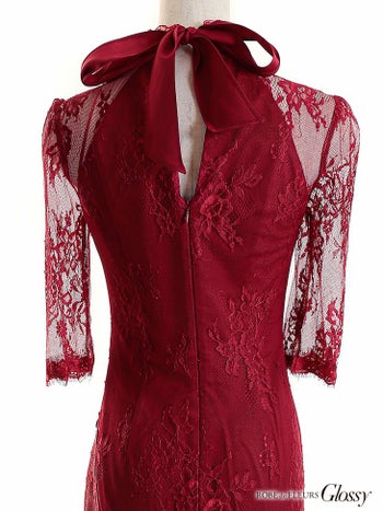 5. 【Glossy by ROBE de FLEURS/グロッシー】レース 袖あり ジップデザイン バックネックリボン セクシー サイドスリット タイトロングドレス (GL2378)