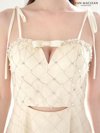 パール×リボンで上品さと可愛さを兼ね備えた欲張りな1着♪ 【JEANMACLEAN/ジャンマクレーン】リボン パール ビジュー カットアウト シースルー フレア キャミソール Aラインロングドレス(51874)
