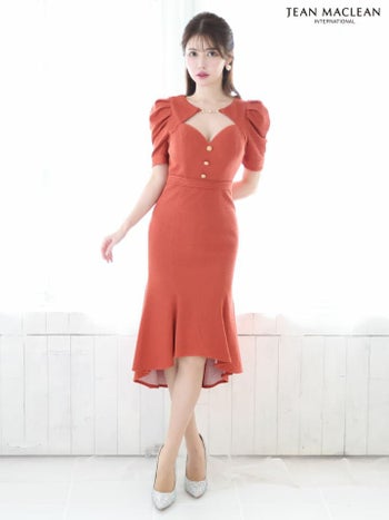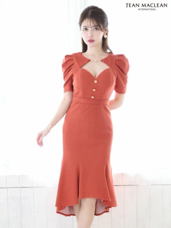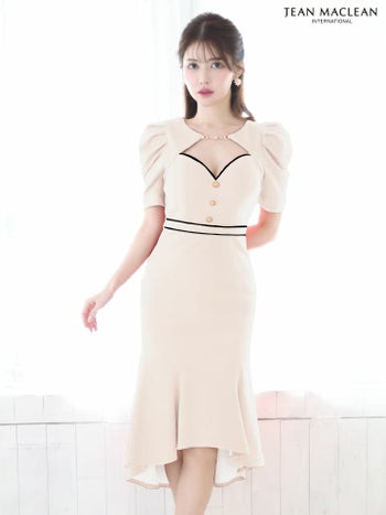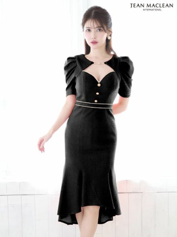 キャバドレス ブランド エレガント オープンバスト 袖あり ゴールドボタン ハイウエスト 柄織りニット 膝丈ドレス
