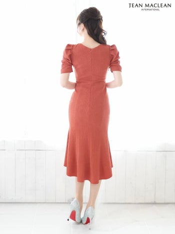 5. 【JEANMACLEAN/ジャンマクレーン】エレガント オープンバスト 袖あり ゴールドボタン ハイウエスト 柄織りニット 膝丈ドレス (55025)