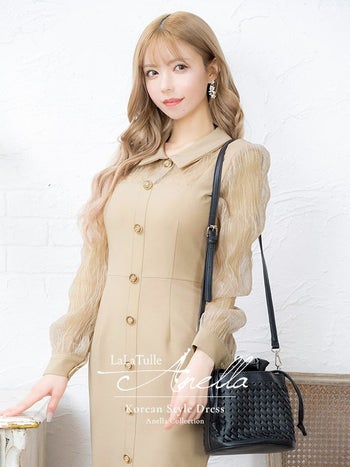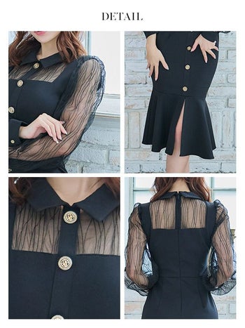 5. SALE【Anella/アネラ】襟付き ゴールドボタン シアー 長袖 エレガント マーメイド 膝丈ドレス