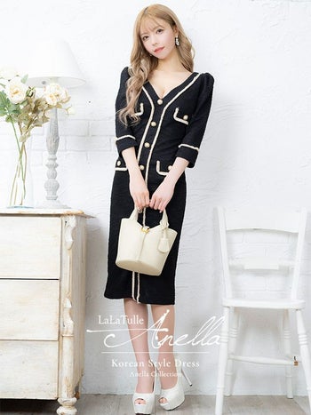 キャバドレス Anella ツイード フリンジライン シンプル 袖あり Vネック スリット タイト 膝丈ドレス
