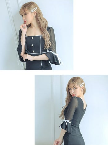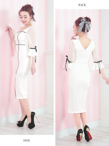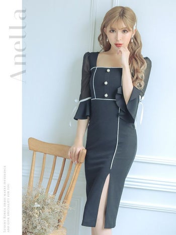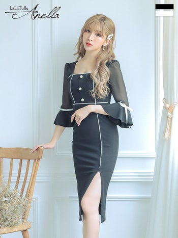 キャバドレス Anella アネラ 袖あり スリット パフスリーブ モノトーン リボン タイト 膝丈ドレス