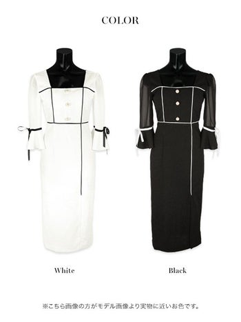 4. SALE【Anella/アネラ】袖あり スリット パフスリーブ モノトーン リボン タイト 膝丈ドレス