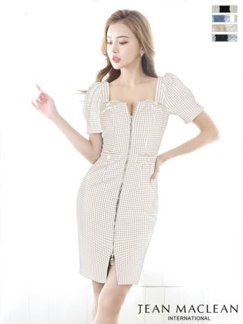 キャバドレス 膝丈ドレス JEANMACLEAN ジャンマクレーン ストレッチ チェック柄 半袖 パフスリーブ フロントジップ ひざ丈ドレス