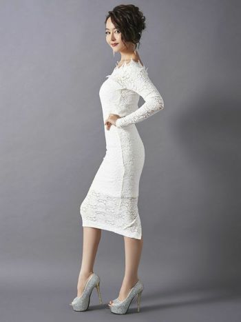高品質な大人綺麗なキャバドレス♪ 総レース長袖 オフショルダー タイトひざ丈ドレス[ホワイト/ワインレッド][青田夏奈着用]