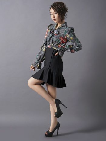 高品質な大人綺麗なキャバドレス♪ グレン チェック×花柄ブラウス風 フレアミニドレス[2color][Lあり][青田夏奈/キャバドレス着用]