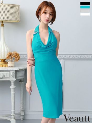 キャバドレス Veautt セクシー ホルターネック ジップデザイン 襟付き オープンバスト ビジュー 膝丈ドレス