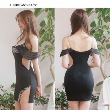 4. 【Angel R/エンジェルアール】セクシー オープンバスト 肩あき シフォンスリーブ ビジュー メッシュ くびれ透け タイトミニドレス (AR24232)