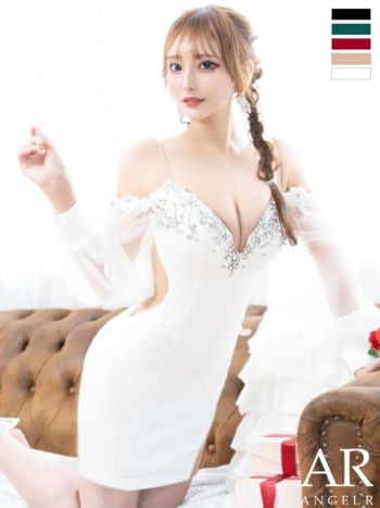 3. 【Angel R/エンジェルアール】バルーンスリーブ 肩あき フラワーレース ビジュー オープンバスト くびれ透け セクシー 長袖 タイトミニドレス (AR24838)