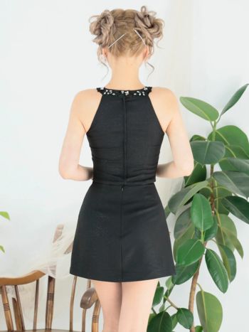 XSあり!気品を感じる一着♪ 【Angel R/エンジェルアール】ホルターネック バストカット ビジュー パールボタン フラワーレース セットアップ ガーリー フレアミニドレス (AR25306)