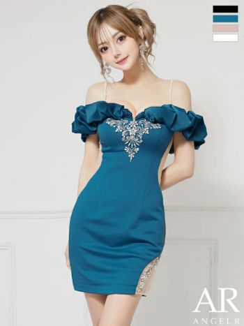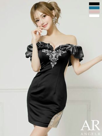 キャバドレス Angel R エンジェルアール オフショルダー 肩あき くびれ透け メッシュ サテン ビジュー フェミニン タイトミニドレス