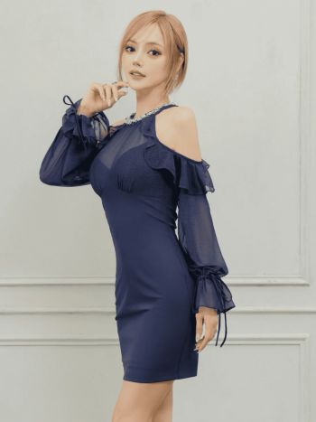 5. 予約商品【1月下旬入荷予定】【Angel R/エンジェルアール】ビジュー ホルターネック 長袖 フリル 肩あき シアー タイトミニドレス (AR25854)