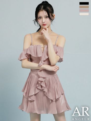 XSあり!シーンに合わせて着こなしのアレンジが可能♪ 予約商品【1月下旬入荷予定】【Angel R/エンジェルアール】バストカット ビジューチェーン フリル シフォン オフショルダー 肩あき フレアミニドレス (AR26806)