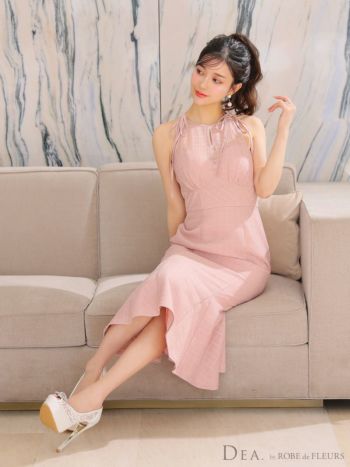 4. 【DEA.by ROBE de FLEURS/ディア】肩リボン デコルテシアー ノースリーブ チェック柄 レース マーメイド フレアロングドレス(DE3324)