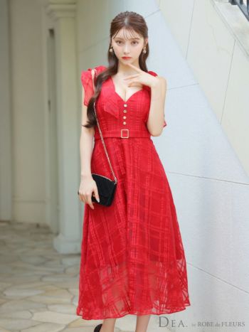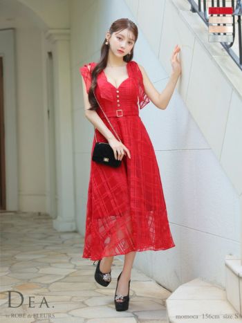 XS~Lあり!肩のリボンは取り外し可能★ 【DEA.by ROBE de FLEURS/ディア】肩リボン チェック柄 オーガンジー ゴールドチェーン キャミソール Aラインロングドレス(DE3346)