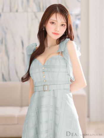 3. 【DEA.by ROBE de FLEURS/ディア】肩リボン チェック柄 オーガンジー ゴールドチェーン キャミソール Aラインロングドレス(DE3346)