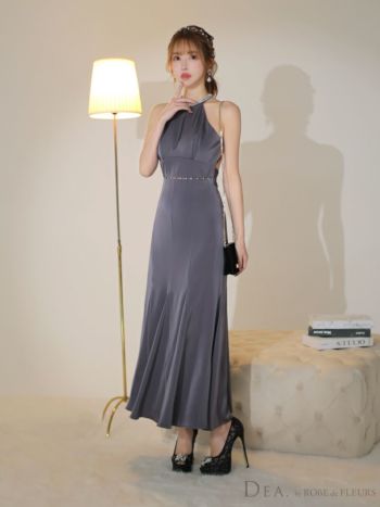 4. 予約商品【2月上旬入荷予定】【DEA.by ROBE de FLEURS/ディア】ビジュー バックオープン エレガント サテン ホルターネック Aラインロングドレス(DE3505)