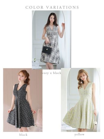 DEA by ROBEdeFLEURS[ディア バイ ローブドフルール]チェック ツイード ノースリーブ Vネック フレア 高級ミディドレス[アイボリー×ブラック][Lあり][るな/キャバドレス着用][2654]