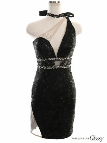 【Glossy by ROBE de FLEURS/グロッシー】スパンコール レース×サイドチュール切替 タイトミニドレス[XSあり][2504-1]