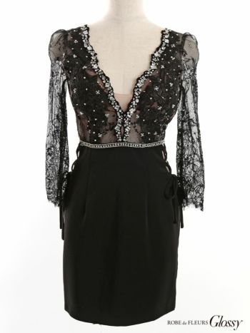 3. 【Glossy by ROBE de FLEURS/グロッシー】ガーリー スパンコール×サイドリボン 袖あり タイトミニドレス(GL2808)