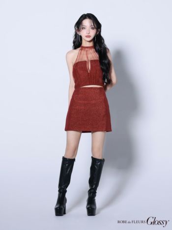 4. 【Glossy by ROBE de FLEURS/グロッシー】フロントシースルー バックリボン チュール ラメニット セットアップ アメリカンスリーブ タイトミニドレス(GL2897)