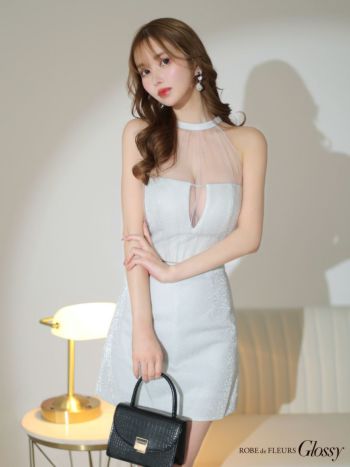 キャバドレス Glossy ROBE de FLEURS グロッシー ローブドフルール フロントシースルー バックリボン チュール ラメニット セットアップ アメリカンスリーブ タイトミニドレス
