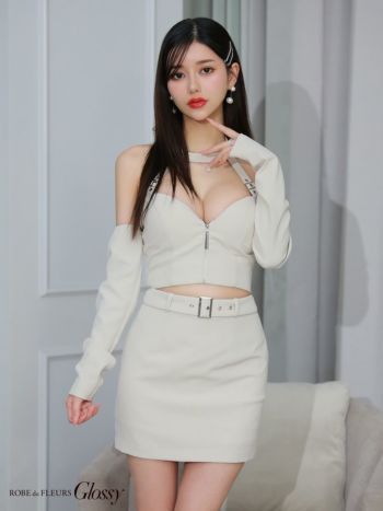 4. SALE【Glossy by ROBE de FLEURS/グロッシー】バックリボン ジップデザイン ホルターネック 2way オフショルダー 長袖 ベルトセットアップ タイトミニドレス(GL3171)