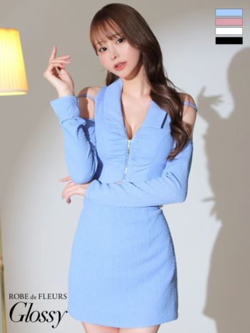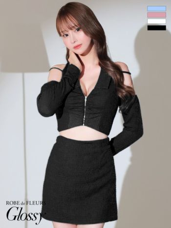 3. 【Glossy by ROBE de FLEURS/グロッシー】ギャザー入りワッフル生地 フロントジッパー ロングスリーブ 肩あき セットアップ タイトミニドレス(GL3244)
