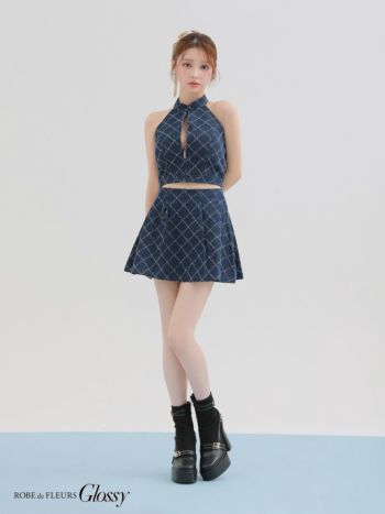 4. 【Glossy by ROBE de FLEURS/グロッシー】ホルターネック セットアップ 斜め格子柄 デニム ジップデザイン フレアミニドレス(GL3287)