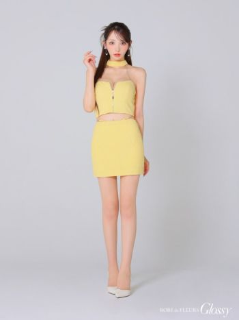 4. 【Glossy by ROBE de FLEURS/グロッシー】セクシー オープンバスト ホルターネック チェーン リボン ワンカラー ジップデザイン セットアップ タイトミニドレス(GL3332)