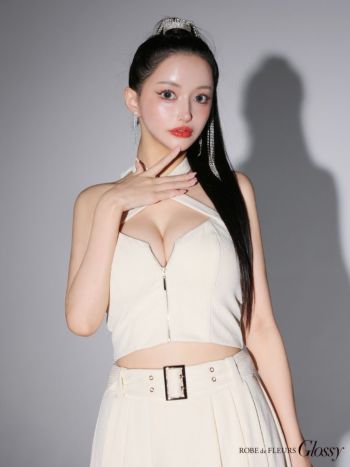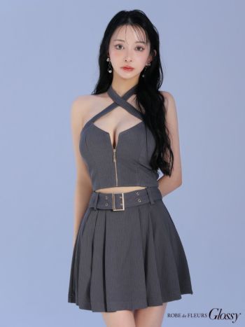 4. 【Glossy by ROBE de FLEURS/グロッシー】セクシー オープンバスト ホルターネック ジップデザイン ベルトデザイン セットアップ プリーツ フレアミニドレス (GL3352)