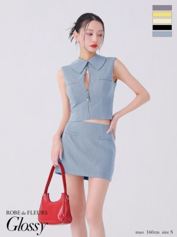 XSあり!セクシーさ全開☆ 【Glossy by ROBE de FLEURS/グロッシー】襟付き ジップデザイン オープンバスト ノースリーブ バックオープン セットアップ セクシー タイトミニドレス (GL3925)