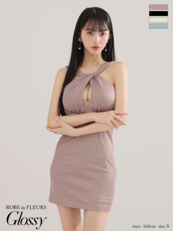3. 【Glossy by ROBE de FLEURS/グロッシー】クロスデザイン ラメニット ストーン ホルターネック セクシー タイトミニドレス (GL3941)