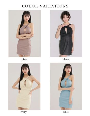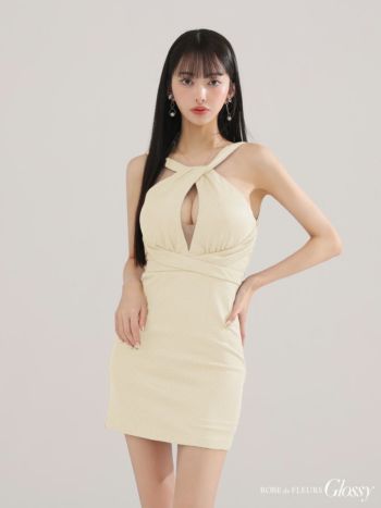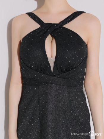 4. 【Glossy by ROBE de FLEURS/グロッシー】クロスデザイン ラメニット ストーン ホルターネック セクシー タイトミニドレス (GL3941)