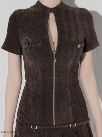 4. 【Glossy by ROBE de FLEURS/グロッシー】ジップデザイン ベルトデザイン プリーツ ワンカラー セクシー 半袖 フレアミニドレス (GL3964)