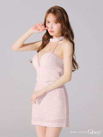 4. 【Glossy by ROBE de FLEURS/グロッシー】バストカット スパンコール ホルターネック セットアップ チョーカー タイトミニドレス(GL4204)