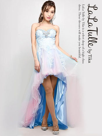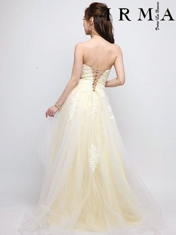 爽やかな雰囲気のグラデーションカラーと裏地がレモンイエローのオシャレなロングテールドレスが2パターン♪