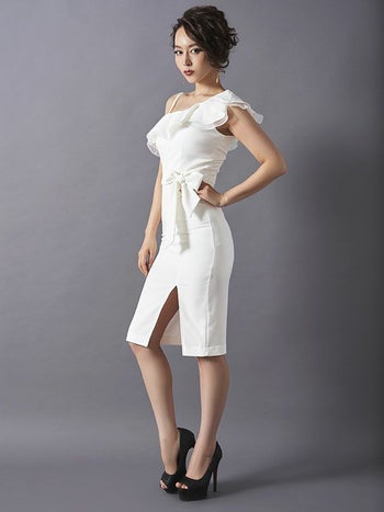 高品質な大人綺麗なキャバドレス♪ ワンカラー フリルショルダー タイトひざ丈ドレス[ホワイト][Lあり][青田夏奈/キャバドレス着用]