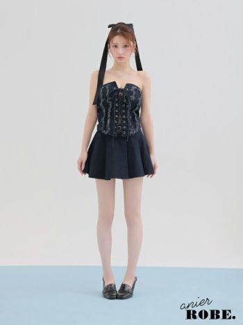 3. 【ANIER./アニエル】ベアトップ デニム レースアップ ベルト セットアップ セクシー フレアミニドレス (anier4049)