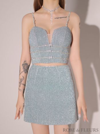 3. 【ROBEdeFLEURS/ローブドフルール】ストレッチ ラメニット ミニリボン ガーリー ビジュー キャミソール セットアップ タイトミニドレス (fm3271)