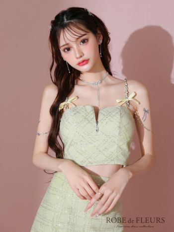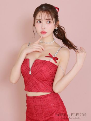 4. 予約商品【2月下旬入荷予定】【ROBEdeFLEURS/ローブドフルール】ガーリー オープンバスト ジップデザイン キャミソール スパンコール 刺繍レース ビジュー ラメニット リボン 台形スカート セットアップ フレアミニドレス(fm3415)
