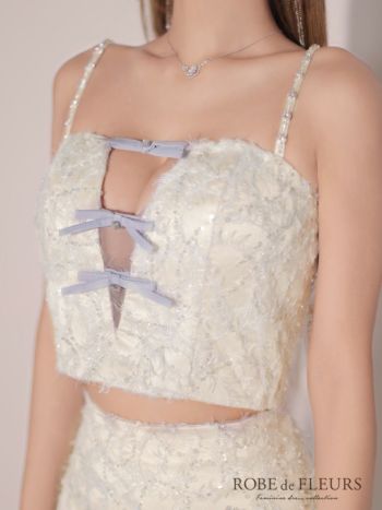 4. 【ROBEdeFLEURS/ローブドフルール】フェザーレース ミニリボン セットアップ ガーリー オープンバスト キャミソール タイトミニドレス (fm3729)