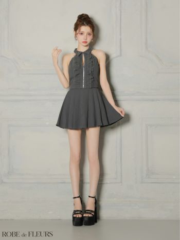 4. 【ROBEdeFLEURS/ローブドフルール】襟付き ホルターネック ビジュー ジップデザイン フリル プリーツスカート セットアップ ガーリー フレアミニドレス (fm4157)