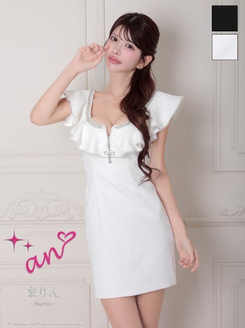 キャバドレス an ノースリーブ ジップデザイン リボン ブローチ付き フリル タイトミニドレス