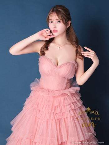 キャバドレス couture an ワンカラー ベアトップ ウエストリボン フリル チュール レースアップ バースデー Aラインロングドレス