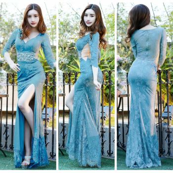 大人上品 袖あり フラワー刺繍レース くびれ透け セクシー ロングスリーブタイトロングドレス