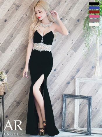 深めのスリットでご自慢の美脚をアピール♪ 【Angel R/エンジェルアール】デコルテ ホルターネック ウエストパールビジュータイトロングドレス (AR22340)