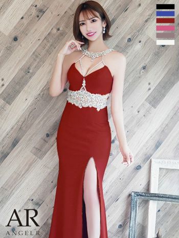 4. 【Angel R/エンジェルアール】ゴージャス デコルテ ホルターネック ウエストパールビジュータイトロングドレス (AR22340)