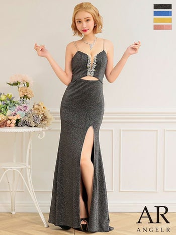 大人気AR23301がロングで登場! 【Angel R/エンジェルアール】キャミソール Vカット ビジューデザイン ラメ サイドスリット タイトロングドレス (AR24323)